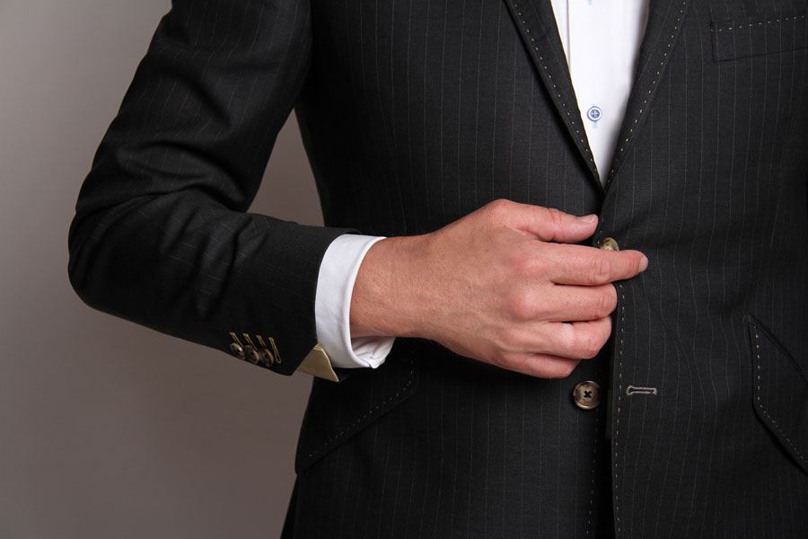 Stunning attention to detail: Covered buttons add a classic touch to a modern double breasted jacket.